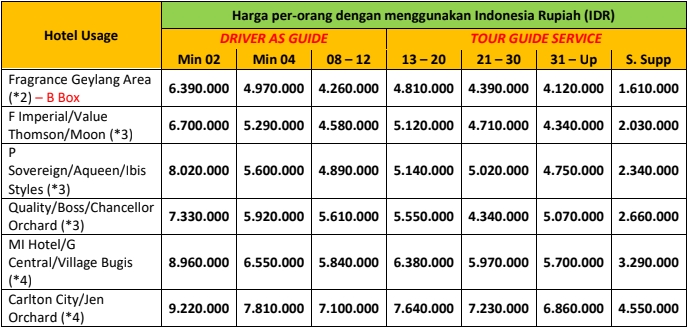 Hari 4 | ![]() Kepulangan dari Singapore Setelah checout dari hotel Anda akan kami antar ke bandara Changi. |